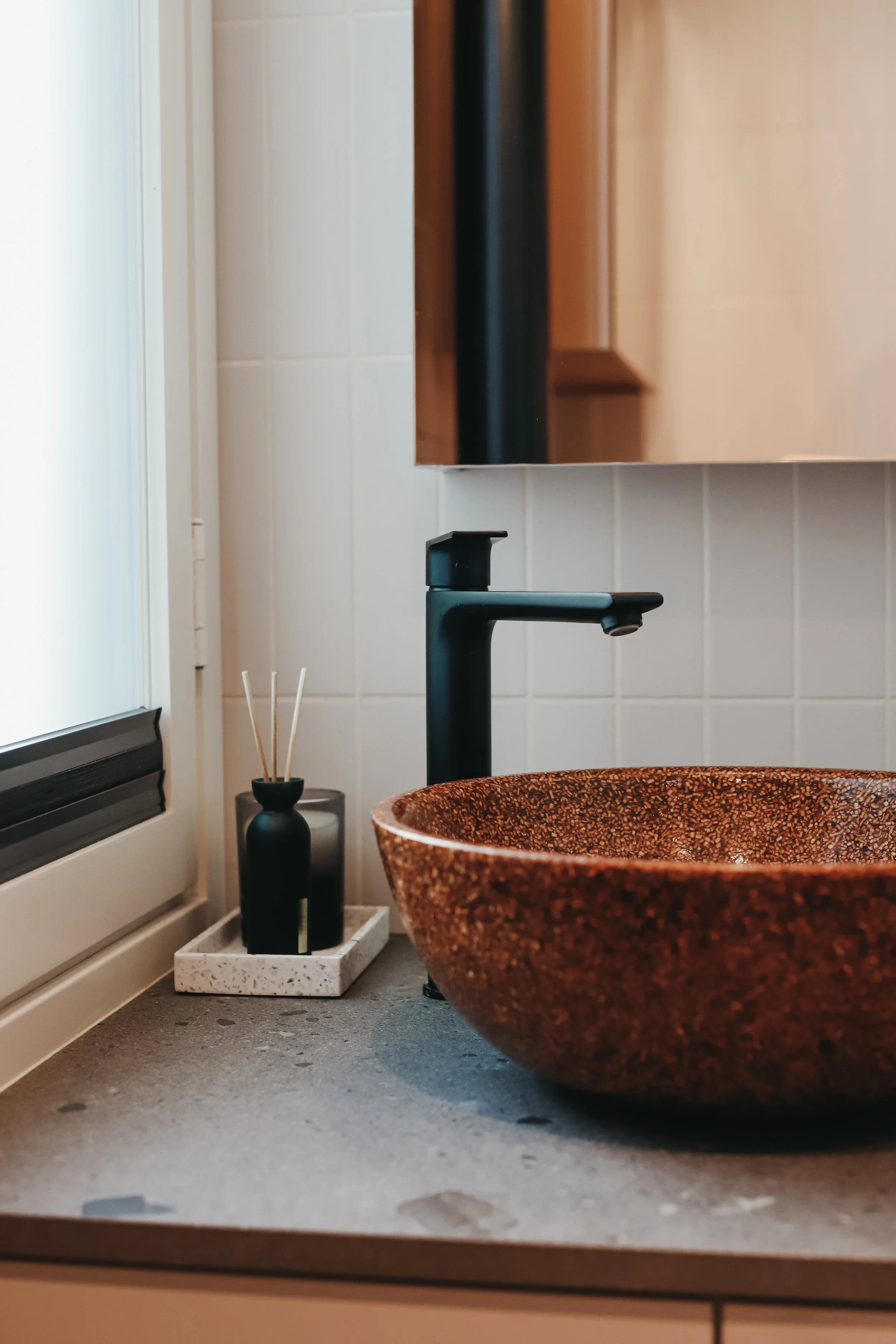 Kylpyhuoneen ja saunan materiaali- ja värivalinnat luovat yleellisen ja rentouttavan tunnelman.